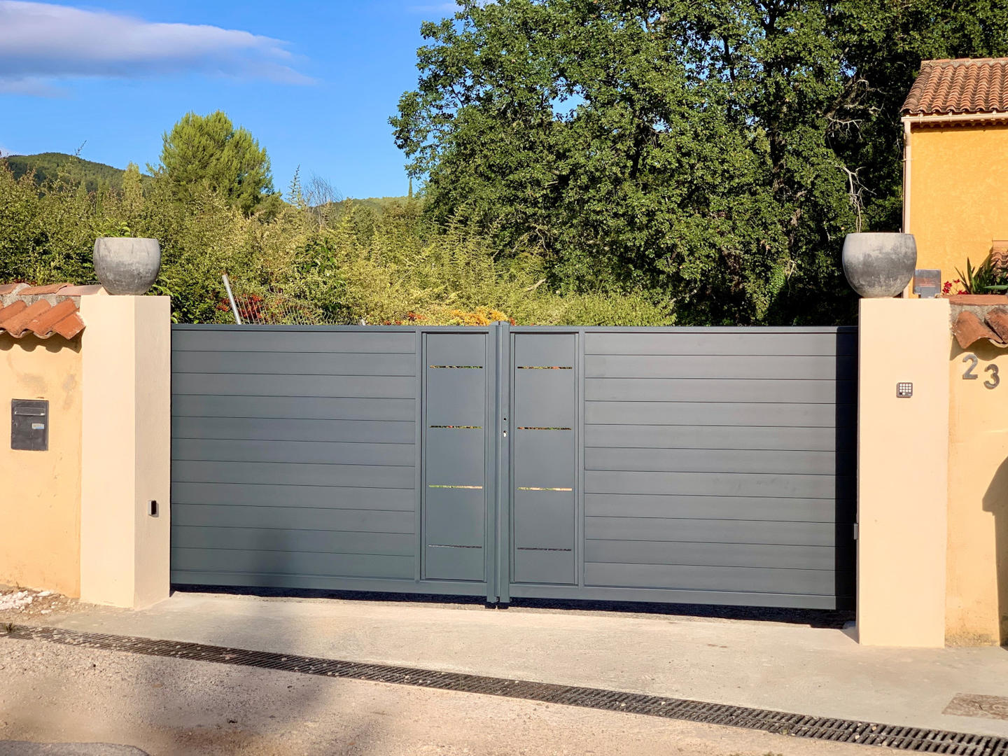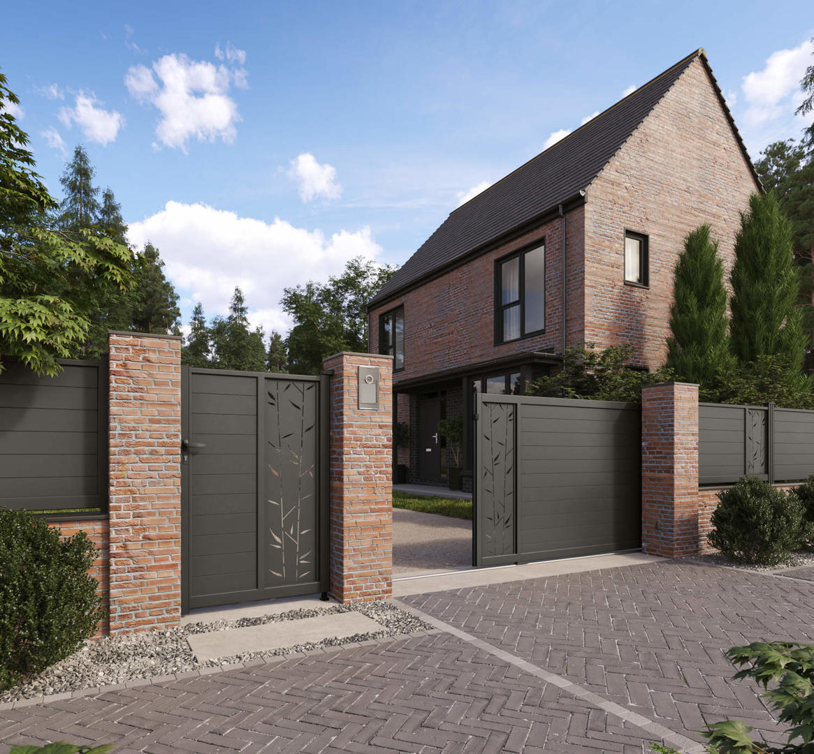 Cette collection propose également des modèles avec panneaux décoratifs en découpe laser, offrant une grande variété de styles et d’emplacements pour vos motifs personnalisés. Vous trouverez aussi des portails à barreaux horizontaux, ainsi que des modèles à claire-voie horizontale avec un effet persienné, qui allient discrétion et élégance tout en laissant filtrer la lumière.