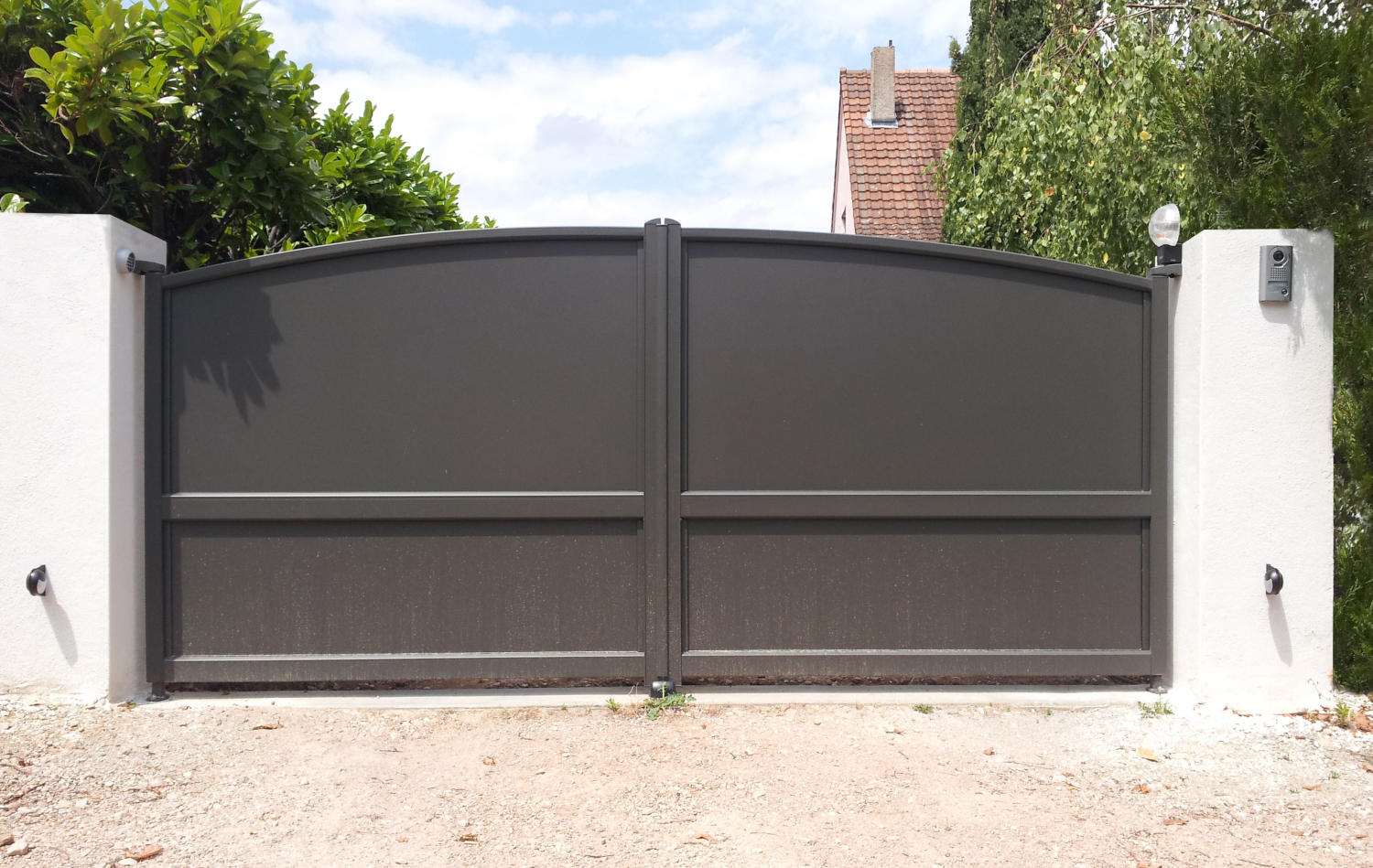 Les portails pleins sont équipés d’un remplissage en tôle aluminium laquée de 2 mm d’épaisseur, assurant une occultation totale et une excellente résistance dans le temps. Ces portails sont disponibles en version battante, coulissante, ainsi qu’en portillons et clôtures, avec plusieurs variantes de formes hautes classiques pour s’adapter au style de votre maison.